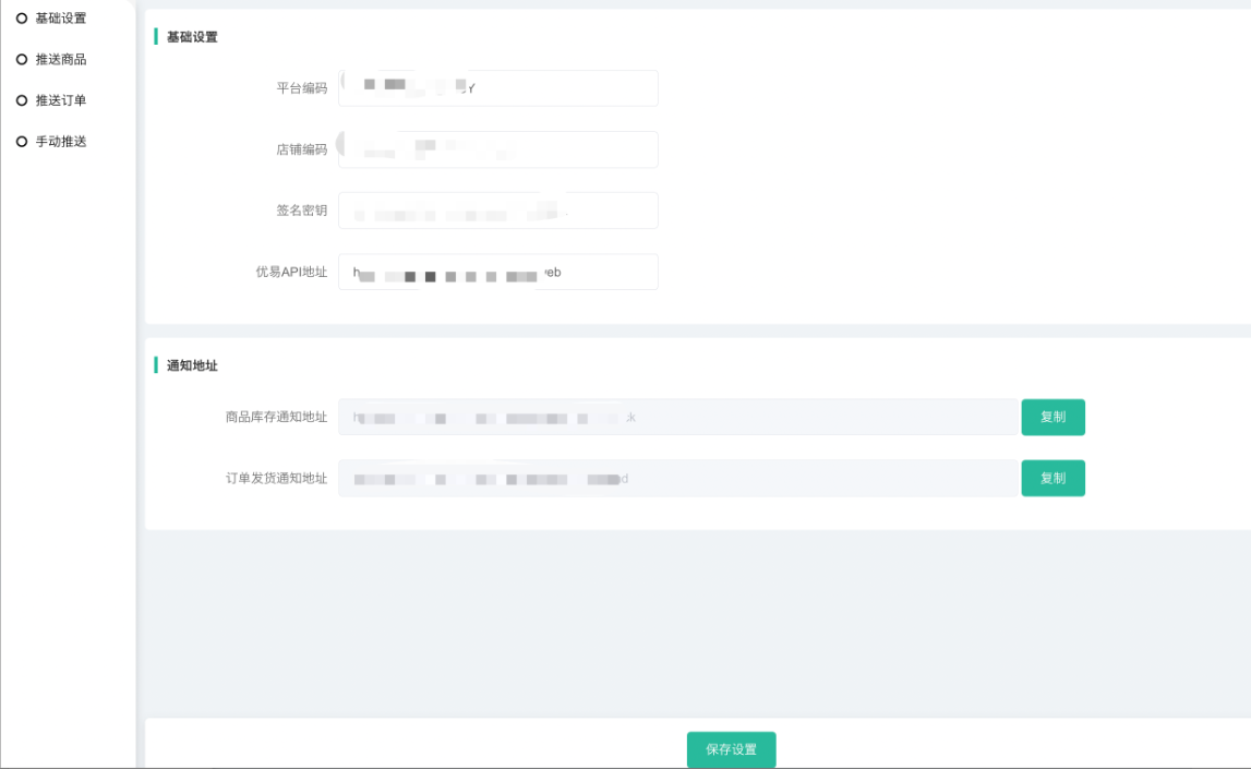 1、平台编码、店铺编码、签名密钥、优易请求地址(每个账户单独请求地址,填写对应请求地址,这方面需联系优易)、商品库存通知地址、订单发货通知地址——需登录(优易官网:http://youyierp.800best.com/)联系优易客服购买接口后获取。注意:填写基础信息时,前后不能有空格,填写完毕后需检查下。