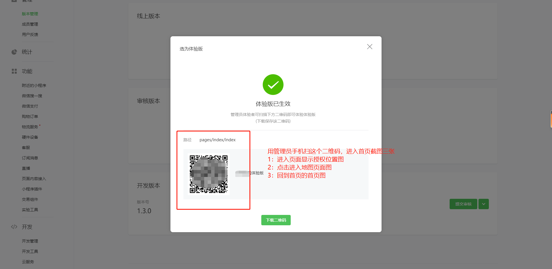 8:小程序后台-开发版本,查看体验版的二维码-扫码截图3张。