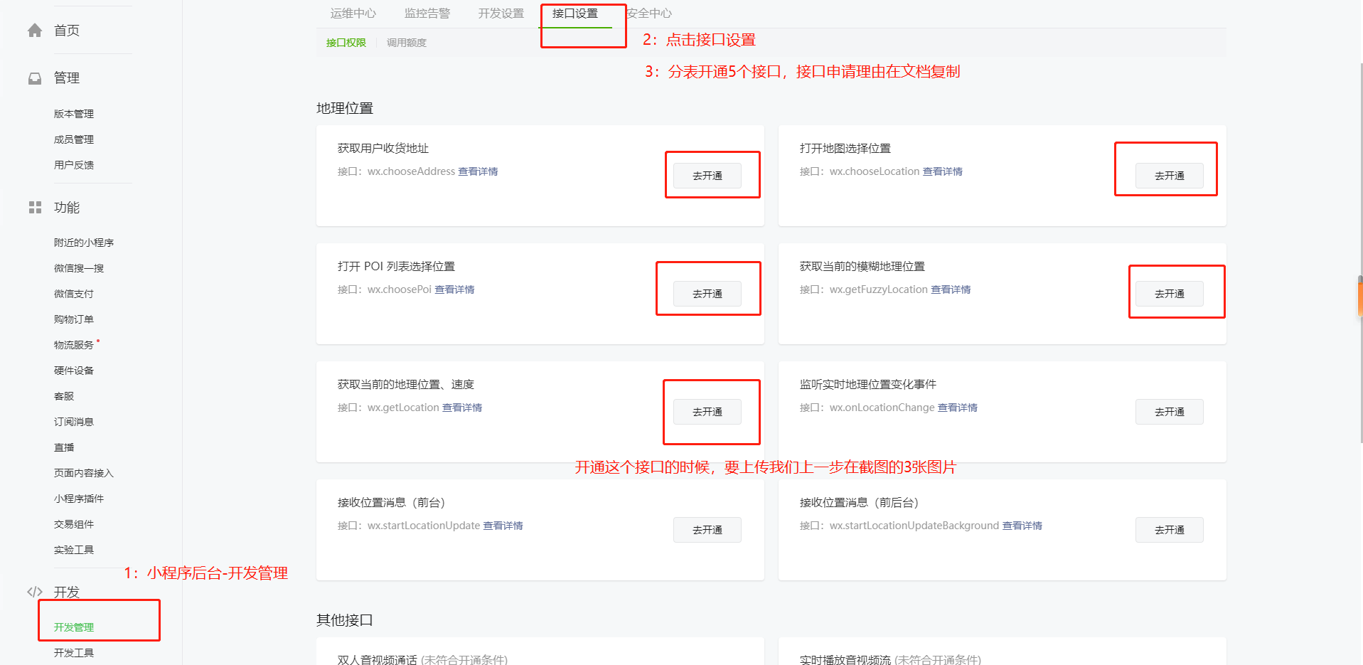 9:小程序后台-开发管理-接口设置处申请开通接口(申请原因如下)