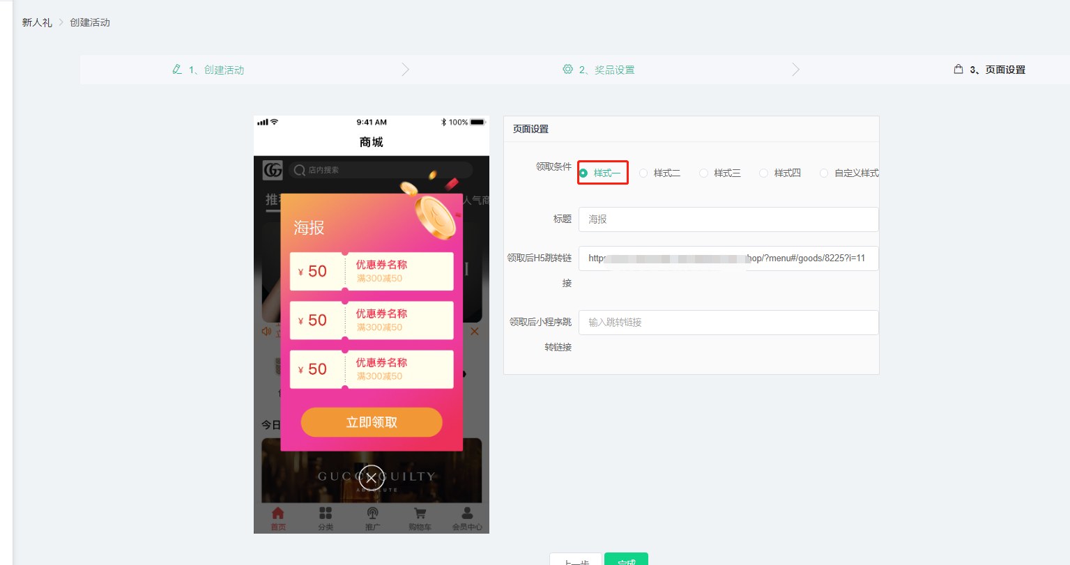 5,页面设置:可选择不同的样式,也可自定义领取样式,设置领取后的跳转链接